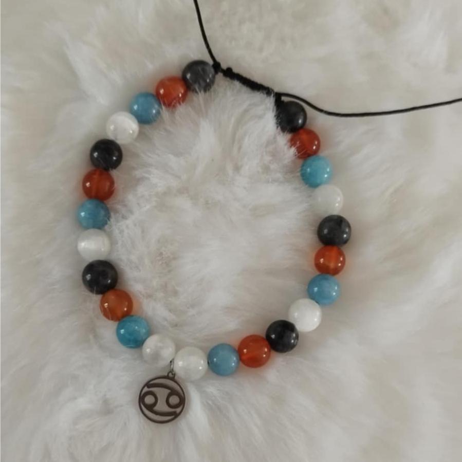 Bracelet signe astrologique "Cancer". Combinaison de quatre perles la Sélénite, la Cornaline, la Labradorite et la Calcédoine bleue, qui sont conçues pour s'associer aux traits de caractère des natifs du signe "Cancer". La breloque "Cancer" est en acier inoxydable.