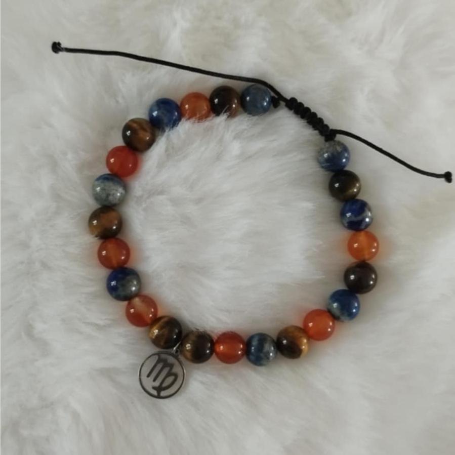Bracelet signe astrologique "Vierge". Combinaison de trois perles l'Oeil de tigre, la Cornaline et le Lapis Lazuli, qui sont conçues pour s'associer aux traits de caractère des natifs du signe "Vierge". La breloque "Vierge" est en acier inoxydable.