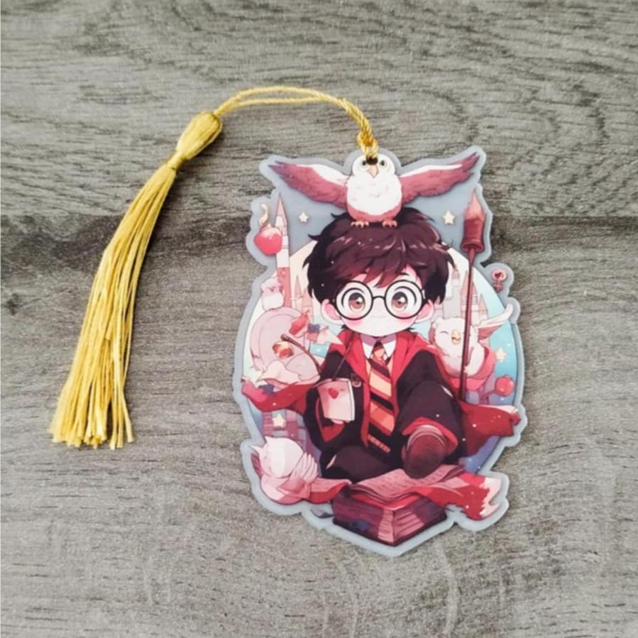 Marque page Harry potter, réhaussé d'un pompon bleu jaune.