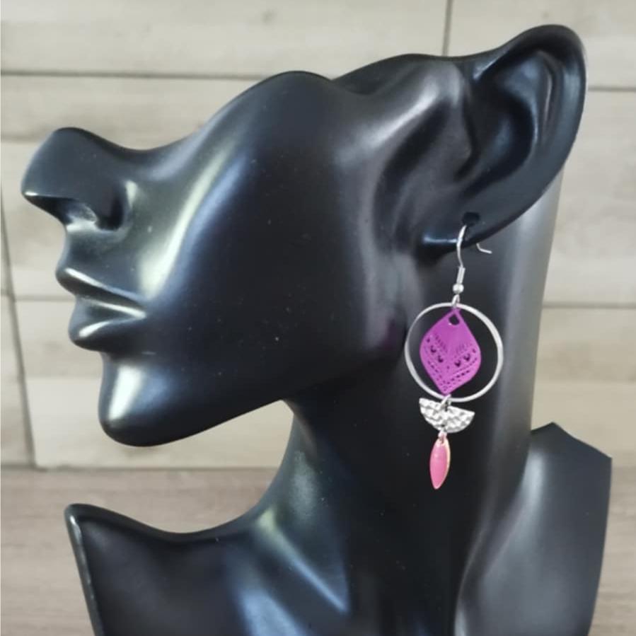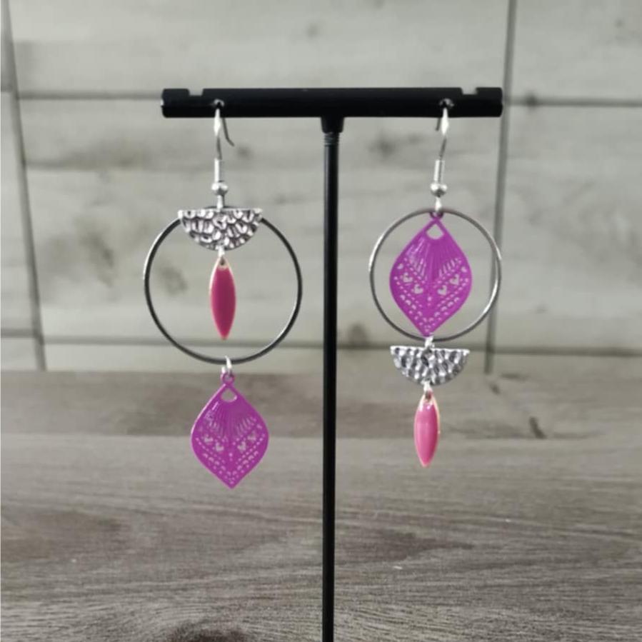L’ensemble de la paire de boucle d'oreilles est en acier inoxydable et laiton, les breloques de couleurs sont en émail.